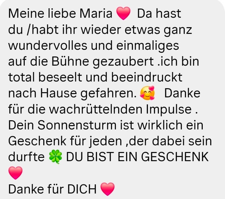 dafür steht Maria Wernicke, die sich seit 5 Jahren mit ihrer Arbeit als Persönlichkeitstrainerin der Aufgabe widmet, in den Menschen mehr Bewusstsein für ein erfülltes Leben zu schaffen.