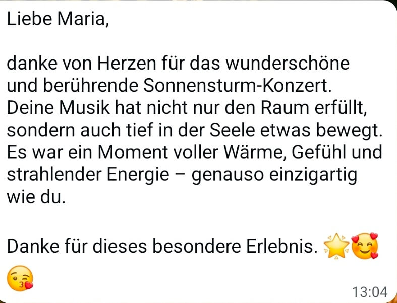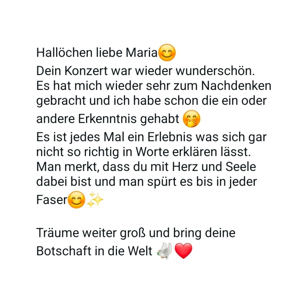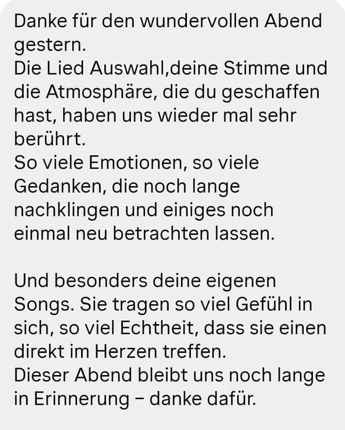 Mit einer Mischung aus berührender Musik, wachrüttelnden Impulsen und Geschichten über den Sinn des Lebens inspirierte sie alle Besucher, wieder mehr auf ihre eigene Stimme zu hören und ihre Lebenszeit den eigenen Träumen zu widmen.